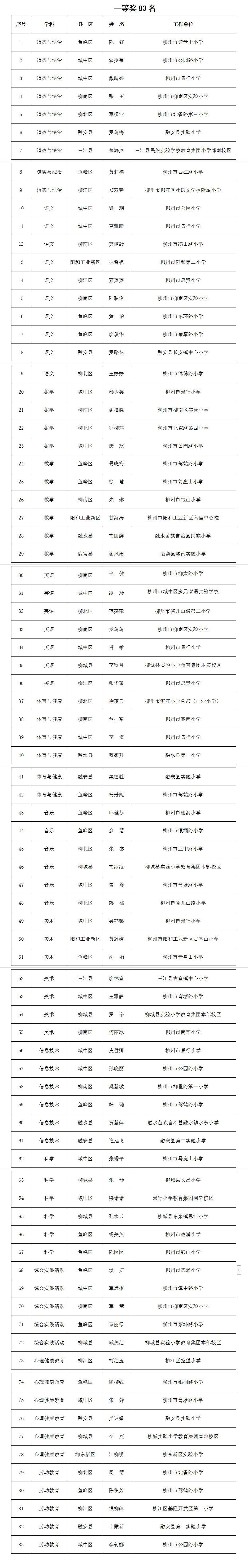 《通知》指出,经专家组评审并报评比工作领导小组审定,共有83名参赛教师和249名指导老师荣获一等奖、86参赛教师和258名指导老师荣获二等奖、109名参赛教师和327名指导教师荣获三等奖,充分展示了我市小学骨干教师扎实的专业水平和综合素养。